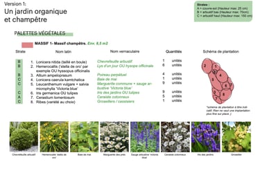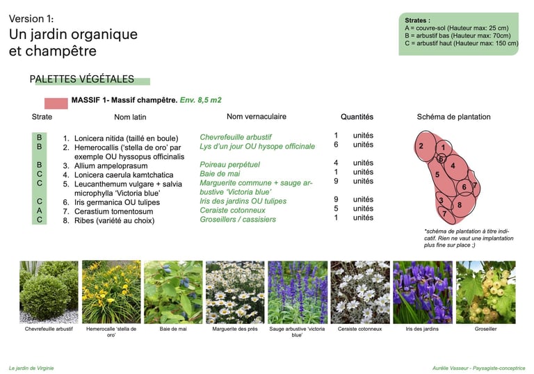 Afin de lui fournir un outil "clé en main" sur lequel s'appuyer lors de ses travaux, j'ai décrit ces scénarios dans un petit livret technique contenant une palette d'inspiration, un croquis d'illustration, un plan de plantation, des listes de végétaux par massif et détails de positionnement des plants. Et comme les semis et plantations dépendent des saisons, le livret intègre également un calendrier des actions à mettre en oeuvre.