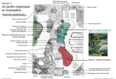 une variante sans le potager qu'elle n'était pas sûre de vouloir vraiment mettre en place et dans un esprit plus structuré rappelant le jardin de curé avec une inspiration British.
